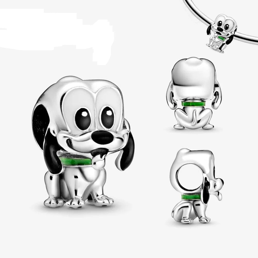 El diseño de Pluto se centra en el agrandamiento de la cabeza y el cuerpo más pequeño que hace destacar su alegre expresión. El charm de Pluto en plata de primera ley se presenta con detalles de esmalte de color negro y verde aplicado a mano.