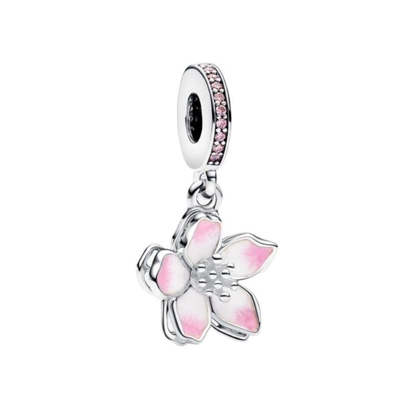 Celebra los primeros signos de la primavera con el Charm Colgante Flor Cerezo en plata de primera ley. Con esmalte de color rosa y blanco aplicado a mano, realzado con brillantes circonitas cúbicas de color rosa, los pétalos de nuestra flor del cerezo giran ligeramente, como mecidas por la brisa. La anilla decorada con pavé es el toque final de este charm floral imprescindible. Combínalo con otras joyas en tonos fríos para crear un look primaveral.